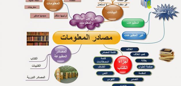 مفهوم مصادر المعلومات يُعرف بأنه عبارة عن وسائل تقوم بنقل المعلومات إلى المستقبل، وتشمل كافة المعلومات المطبوعة مثل الكتب والنشرات والتقارير، والمعلومات غير مطبوعة مثل المواد البصرية والمواد السمعية. مصادر المعلومات تؤخذ مصادر المعلومات من عدّة مصادر هي: مصادر المعلومات التقليدية، ومصادر المعلومات السمعية والبصرية، ومصادر المعلومات الإلكترونية، وهي بالتفصيل كالآتي. مصادر المعلومات التقليدية الكتب التي تعتبر من أكثر مصادر التعليم انتشاراً، ومن أكثر المواد التي تضم المعرفة والمعلومات بكافة أبعادها، وتمتاز بسهولة الحمل، والثمن القليل، مثل: الكتب الدراسية، أي المنهاج التعليمية في المدارس مثل: كتاب الرياضيات، واللغة العربية. كتب أحادية الموضوع التي تحتوي على المعلومات العامة، والحقائق الأساسية، والمبادئ، والمفاهيم. المراجع ومن أنواعه: دوائر المعارف الموسوعات، والمعاجم والقواميس، والأدلة، والتقاويم، والكتب السنوية، والمخطوطات، والكشافات، والرسوم البيانية، والكتب الإرشادية، والمستخلصات، وقوائم الببليوجرافيات والكتب، والحوليات، و براءات الإختراع، والرسائل الجامعية، والمطبوعات الرسمية. الدوريات التي تملك عنواناً مميزاً، وهي مواد غير مجلدة تتواجد على عدّة أجزاء متتالية، مثل: الصحف، والمجلات، والجرائد، والكتب المدرسية. النشرات والكتيبات، وهي المواد المطبوعة لكن ليس بشكل دوري، وهي ليست مجلداً وتقل في الحجم عن الكتاب. القصاصات التي تعمل على إنشاء أرشيف لكافة المعلومات في مراكز التعلم داخل المدرسة. مصادر المعلومات السمعية والبصرية المواد البصرية التي تعتمد بشكل أساسي على حاسة البصر لتوصيل المعلومة، مثل: المجسمات، والصور، والنماذج، والعينات، والرسوم، والمصغرات الفيلمية، والشفافيات، واللوحات، والخرائط، والشرائح المجهرية، والألعاب الذهنية، والدمى. المواد السمعية، التي تعتمد بشكل أساسي على حاسة السمع لتوصيل المعلومة، مثل: التسجيلات الصوتية، والكــتب السمعية، والأشرطة الصوتية، والبرامج الإذاعية، والإسطوانات الصوتية. المواد السمعيّة البصرية التي تعتمد بشكل أساسي على السمع والبصر معاً لتوصيل المعلومة، مثل: تسجيلات الفيديو، والشفافيات الناطقة، والبرامج التلفزيونية، والأفلام الناطقة، والشرائح الفيلمية الناطقة. مصادر المعلومات الإلكترونية هي كافة المعلومات التي نحصل عليها بشكل غير ورقي وغير تقليدي، حيث تكون هذه المعلومات مخزنة إلكترونياً، وتؤخذ المعلومات الإلكترونية من عدّة مصادر، تتمثل في: شبكة الإنترنت. قواعد البيانات من خلال الاتصال المباشر. الشبكات التعاونية. الشبكات المحلية والدولية و الإقليمية. تجار المعلومات. الأقراص المتراصة. أنواع مصادر المعلومات تقسم مصادر المعلومات إلى نوعيْن هما: المصادر الوثائقية مثل: المصادر الأولية، والمصادر الثانوية، والمصادر من الدرجة الثالثة. المصادر غير الوثائقية مثل: المصادر الرسمية التي تحتوي المعلومات الإعلامية والإرشادية والاستشارية، والمصادر غير الرسمية المعروفة باسم المصادر الشخصية، والتي يحصل عليها من خلال الحوارات والمؤتمرات والندوات واللقاءات.